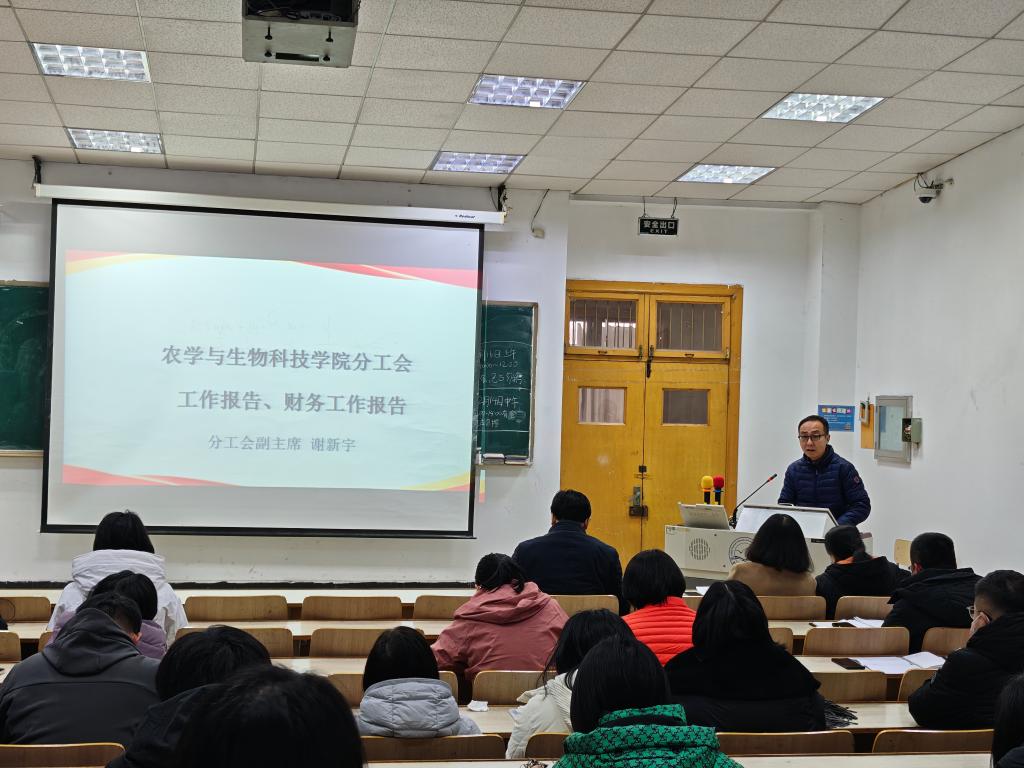 经院党委同意、校工会批准,农学与生物科技学院分工会于2025年12月13日下午2点召开了第四届第一次教职工暨工会会员大会。教职工暨工会会员共61人参加了会议。会议由学院分工会主席高欣主持。