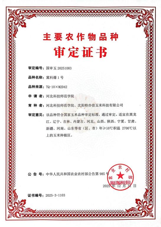 近日,中华人民共和国农业部公告第985号发布,由我校农学与生物科技学院王健博士领衔的特种玉米育种团队选育的“冀科爆1号”通过第五届国家农作物品种审定委员会第八次主任委员会议审议通过,审定编号为国审玉20251083。适宜在黑龙江、辽宁、吉林、内蒙古、河北、山西、陕西、宁夏、甘肃、新疆、河南、山东等省自治区年≥10℃积温2700℃以上的玉米种植区种植。这是河北省首个爆裂玉米新品种通过国家审定,也是我校有史以来首个国审玉米新品种,填补了我校玉米种质创新领域国审品种缺位的空白,标志着我校在玉米种质创新领域取得新突破。